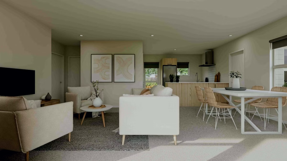 Οι καθαρές γραμμές ορατότητας μεταξύ του καθιστικού, της τραπεζαρίας και της κουζίνας δημιουργούν έναν άνετο χώρο για καθημερινή ζωή. Η κουζίνα στεγάζεται σε σχήμα U και περιλαμβάνει ένα μπαρ φαγητού για γρήγορα γεύματα και σνακ. Τα υπνοδωμάτια καταλαμβάνουν την αριστερή πλευρά του σχεδιασμού και βρίσκονται απέναντι από ένα πλήρες μπάνιο και ένα βοηθητικό σπίτι.
