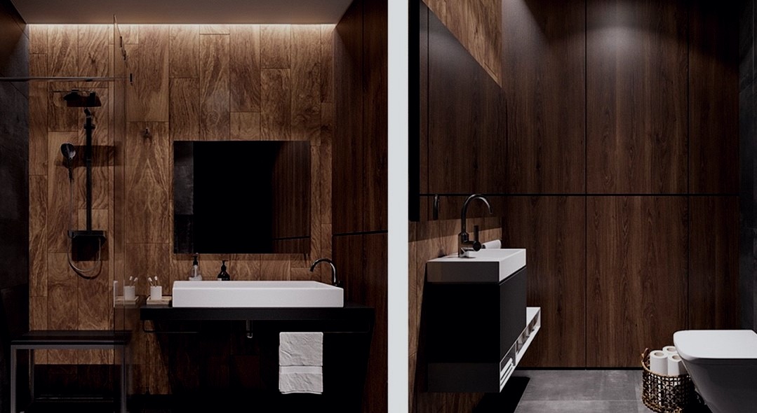 Το μπάνιο είναι μια επέκταση της κρεβατοκάμαρας. Οι ξύλινοι τοίχοι συναντώνται με την αντίθεση ενός καθαρού λευκού νιπτήρα και τουαλέτας. Υπάρχουν βιομηχανικά στοιχεία και εντυπωσιακός φωτισμός. Αυτός ο χώρος δίνει μια σύγχρονη αίσθηση.