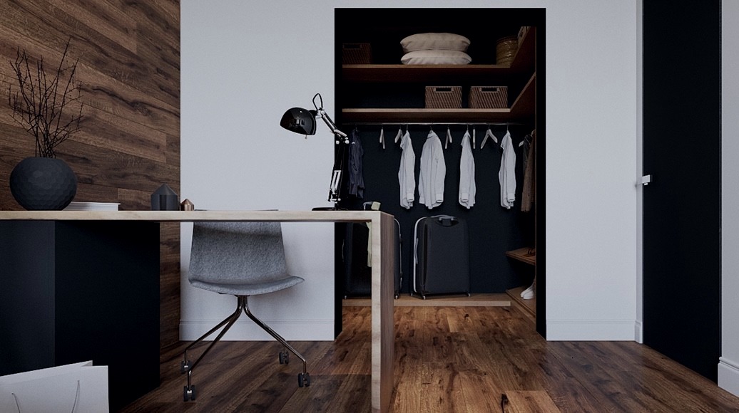 Ένα γραφείο στο σπίτι έχει στηθεί στην κρεβατοκάμαρα. Αυτό λειτουργεί καλά αν δεν υπάρχει άλλος χώρος στο σπίτι και το γραφείο ταιριάζει με το σχέδιο. Το σκούρο γκρι της ντουλάπας και τα ίδια χρώματα στο γραφείο τα συνδυάζουν όλα. Φαίνεται σαν να ήταν γραφτό να βρίσκεται εκεί. Ταιριάζει και αξιοποιεί τον χώρο στο δάπεδο ανάμεσα στο κρεβάτι και την γκαρνταρόμπα.
