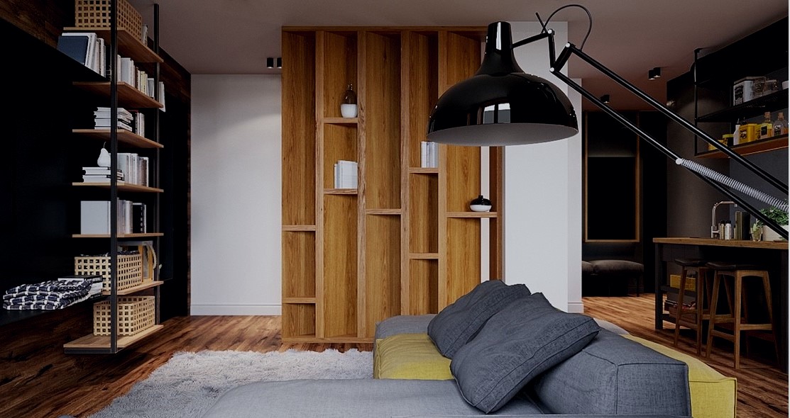 Αντί να χτίσει πολλούς τοίχους, κάτι που θα έκανε τον χώρο να φαίνεται μικρός, ο σχεδιαστής επέλεξε να χρησιμοποιήσει βιβλιοθήκες για να χωρίσει τα δωμάτια. Η είσοδος ανοίγει στο σαλόνι. Η διαφανής βιομηχανική βιβλιοθήκη εκτείνεται σε όλο το χώρο από την οροφή μέχρι το πάτωμα.