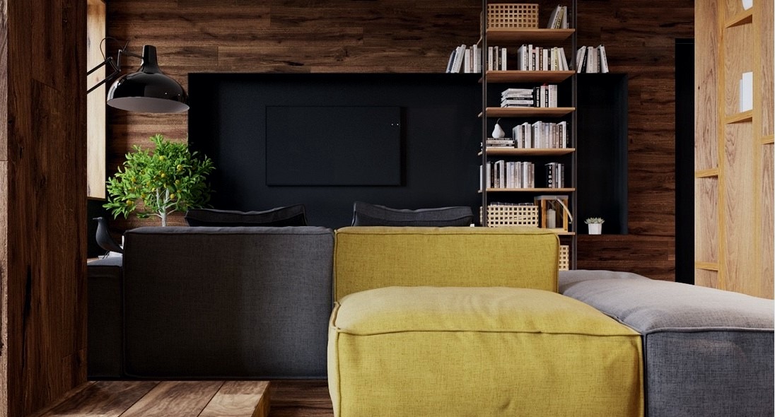 Αυτός ο ανοιχτός χώρος χρησιμοποιεί πιο σκούρα χρώματα από τον πρώτο, αλλά έχει ενσωματώσει πινελιές κίτρινου για να τον φωτίσει. Αυτός ο γκρι καναπές είναι ένα εξαιρετικό παράδειγμα. Αν και ο καναπές είναι ουδέτερος, ένα μαξιλάρι είναι κίτρινο μουσταρδί.