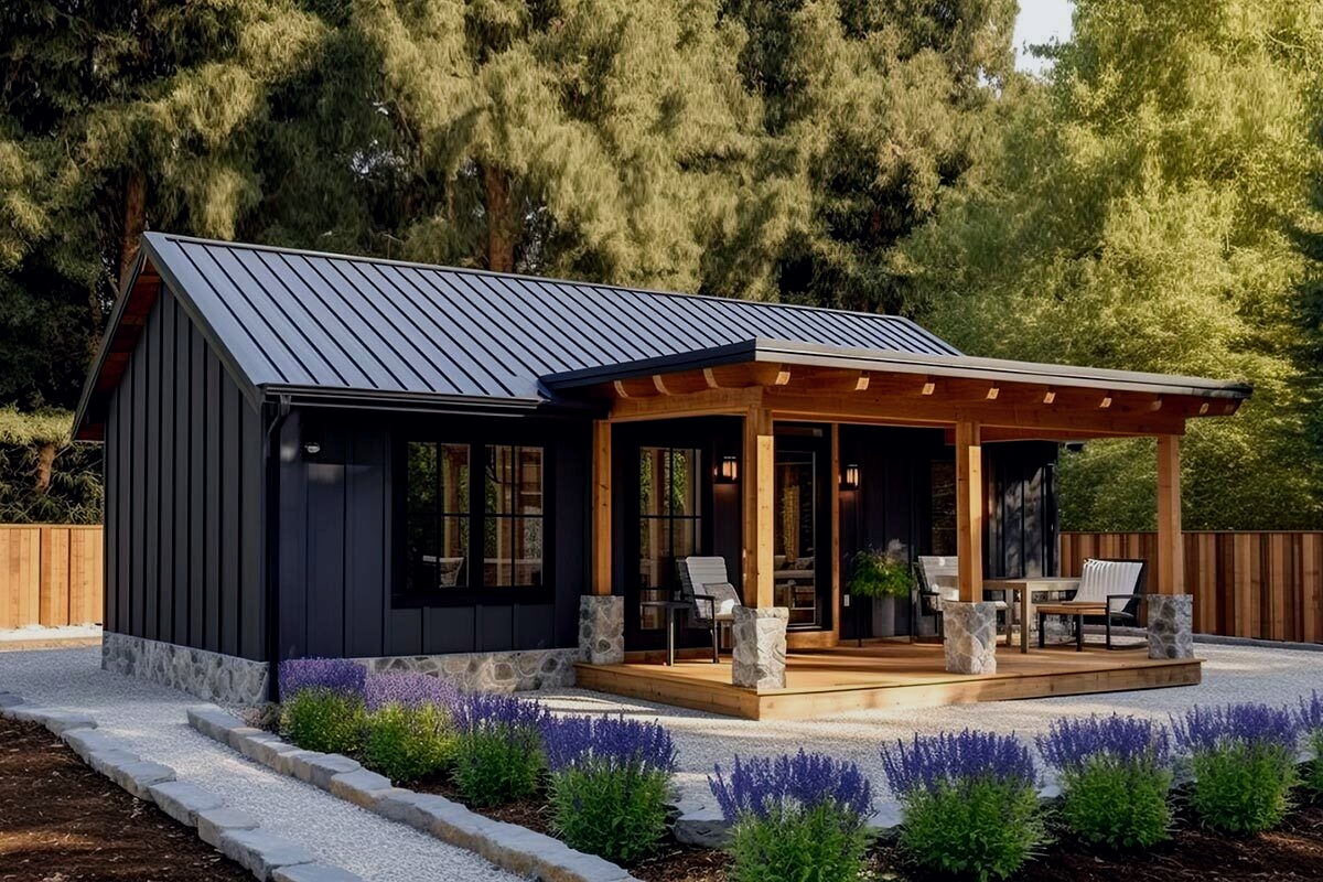 Με συνολικά 80 θερμαινόμενα τετραγωνικά μέτρα, αυτό το σπίτι προσφέρει μια νέα εκδοχή του ρουστίκ, ορεινού στιλ σπιτιού με σανίδες και σανίδες επένδυσης που υψώνονται μέχρι να συναντήσουν μια μεταλλική στέγη με νευρώσεις. Μια μπροστινή βεράντα σε στυλ πέργκολας εκτείνεται από το μπροστινό μέρος του σπιτιού για να προσφέρει έναν εξωτερικό χώρο διαβίωσης για να τον απολαύσουν όλοι.