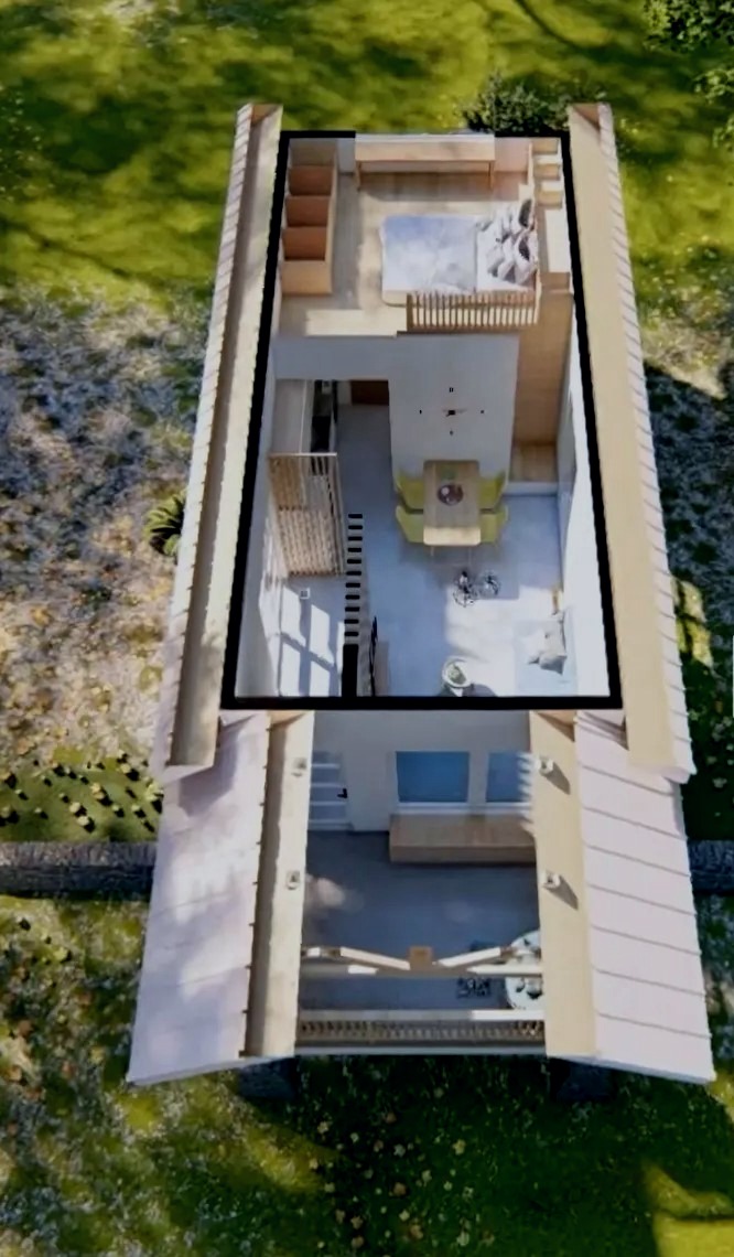 Αυτό το μοναδικό σχέδιο κατοικίας είναι ένα μινιμαλιστικό αλλά άνετο μοντέρνο μικροσκοπικό σπίτι. Είναι πλήρες με βασικούς χώρους καθώς και σοφίτα και βεράντα!